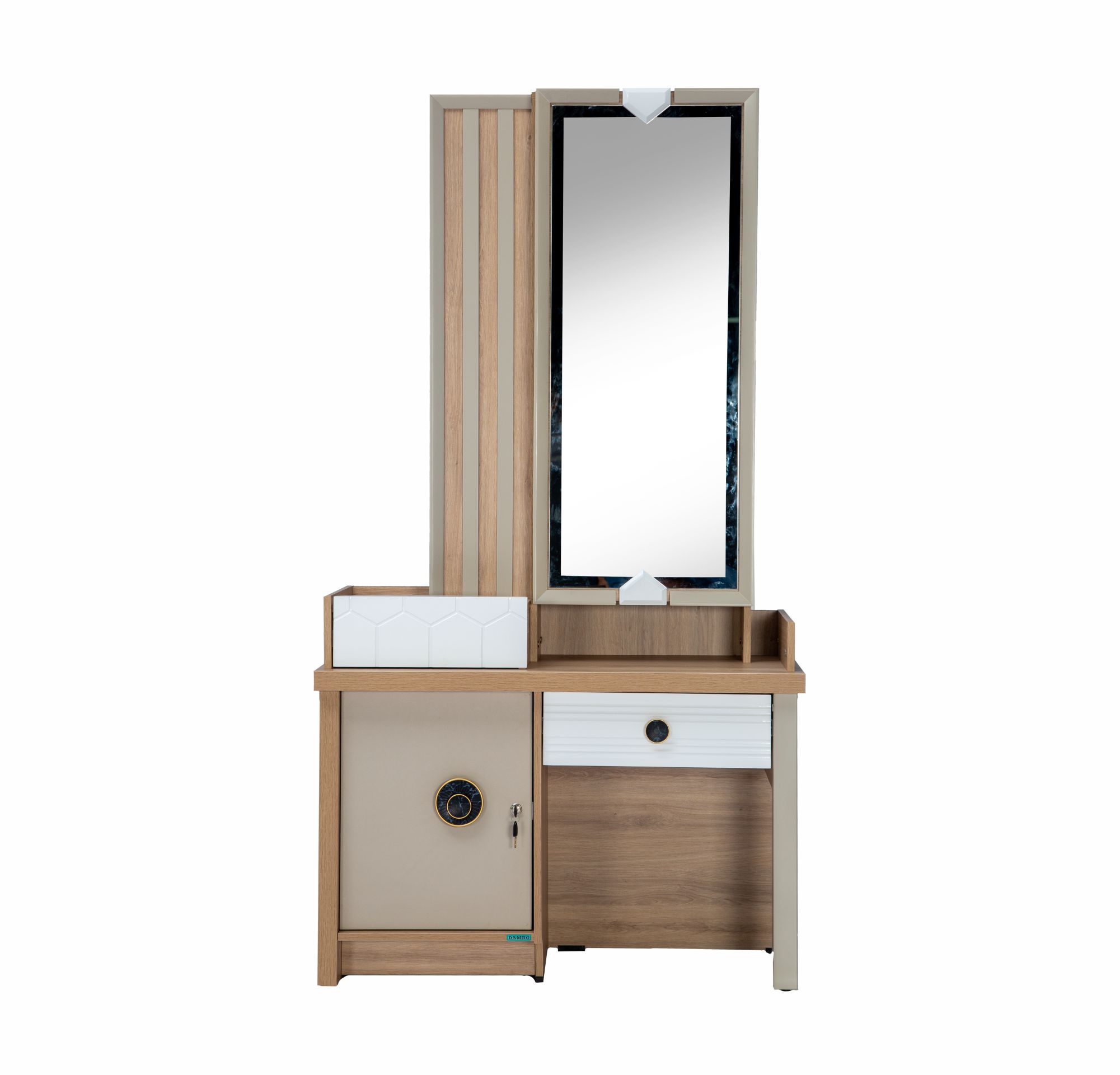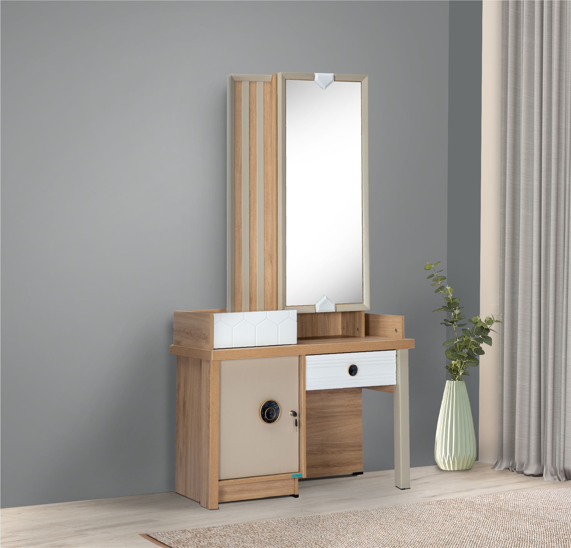 The Angela Dressing Table is contemporary bedroom furniture to help you get ready in style. This charming wooden dressing table has a tabletop drawer with partition strips to organize your jewelry and other items. The cabinet with door and lock and the drawer with knob offers plenty of additional storage. It comes equipped with a half mirror with a sliding door that conceals storage shelves and a convenient bangle holder. It has a unique two-tone design that will complement your bedroom and add to its aesthetics. A must-buy for your home!