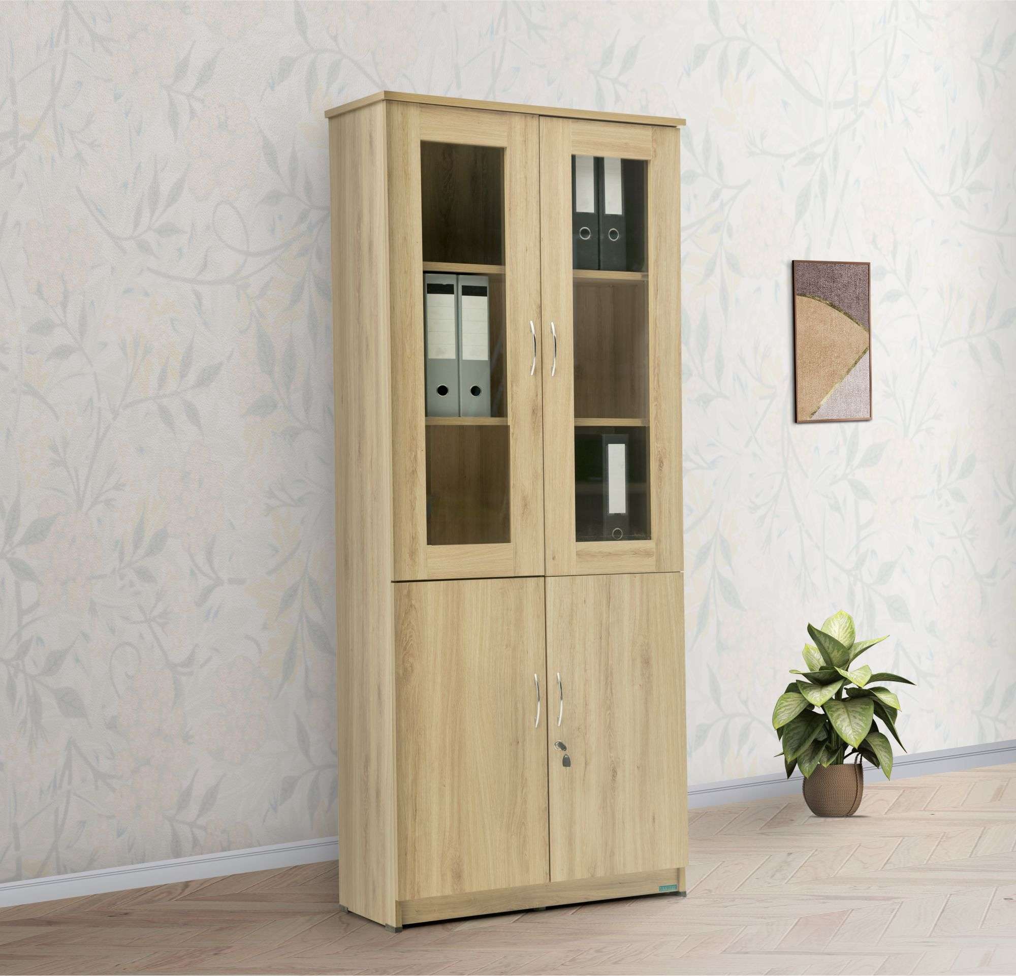 - Top storage with framed glass shutter