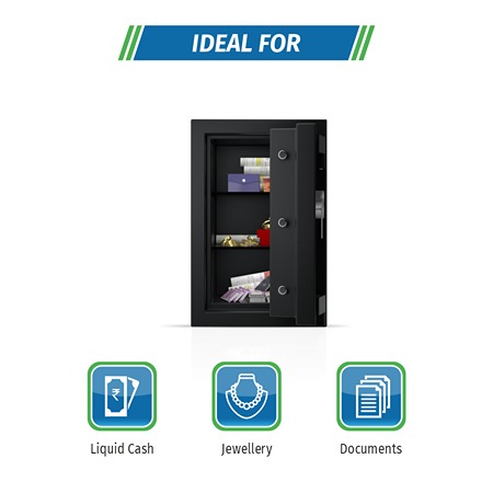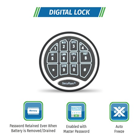 Strong double-walled constructionPowder coated finishArmoured plate in door and body to provide added protectionInterior carpetAdjustable shelvesEnabled with a master passwordNon volatile memory prevents password erasure, when the battery is lowSecondary relocking device to resist any forced attempts of disengaging the lock from bolt work mechanismDigital Keypad