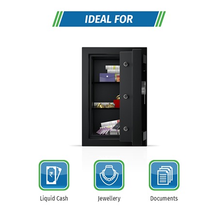 Strong double-walled constructionPowder coated finishArmoured plate in door and body to provide added protectionInterior carpetAdjustable shelvesEnabled with a master passwordNon volatile memory prevents password erasure, when the battery is lowSecondary relocking device to resist any forced attempts of disengaging the lock from bolt work mechanismDigital Keypad