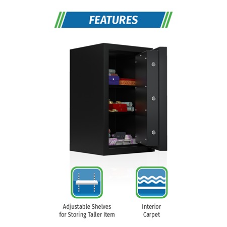 Strong double-walled constructionPowder Coated FinishAdjustable shelvesInterior CarpetArmoured plate in door and body to provide added protectionSecondary relocking device to resist any forced attempts of disengaging the lock from bolt work mechanismSafe comes with Gordian lock that opens with two keys (Manual variant only)
