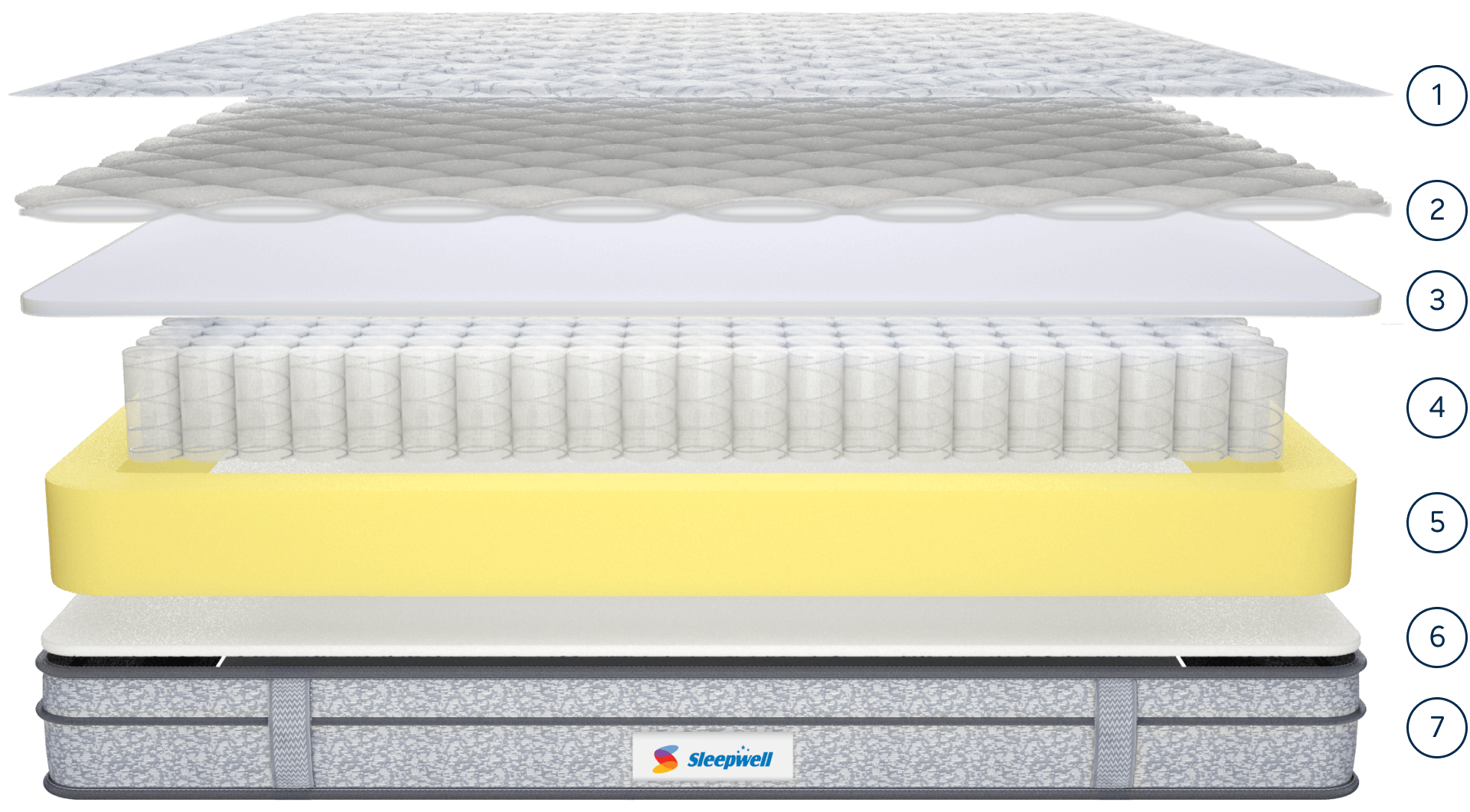 A medium-firm mattress with Euro-top finish and soft Sleepwell Resitec® foam for added gentle comfort. Underneath are pocket springs, which are best for supple support and which also entirely eliminate partner disturbance. Sleepwell Quiltec® quilting with premium knitted fabric adds softness with a smooth touch. Foam wall technology prevents side sagging and gives a more comfortable sitting experience. Sleepwell Neem Fresche® provides germ protection.