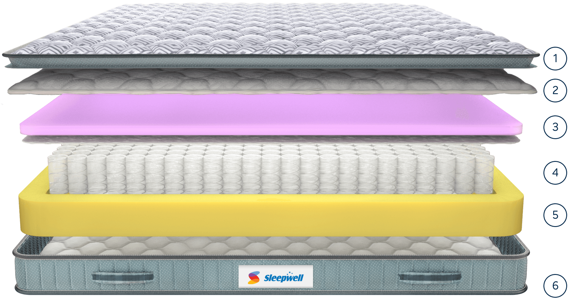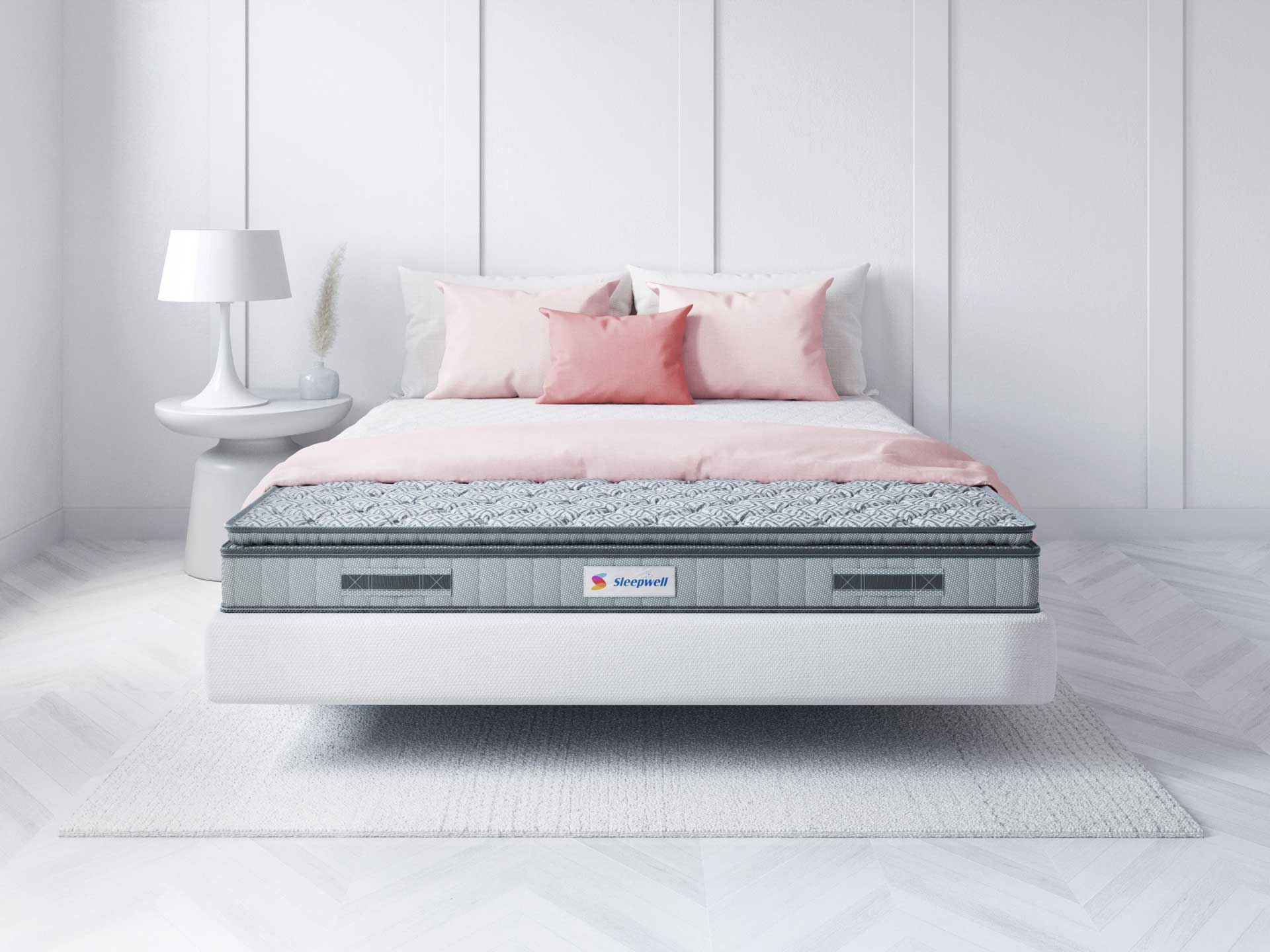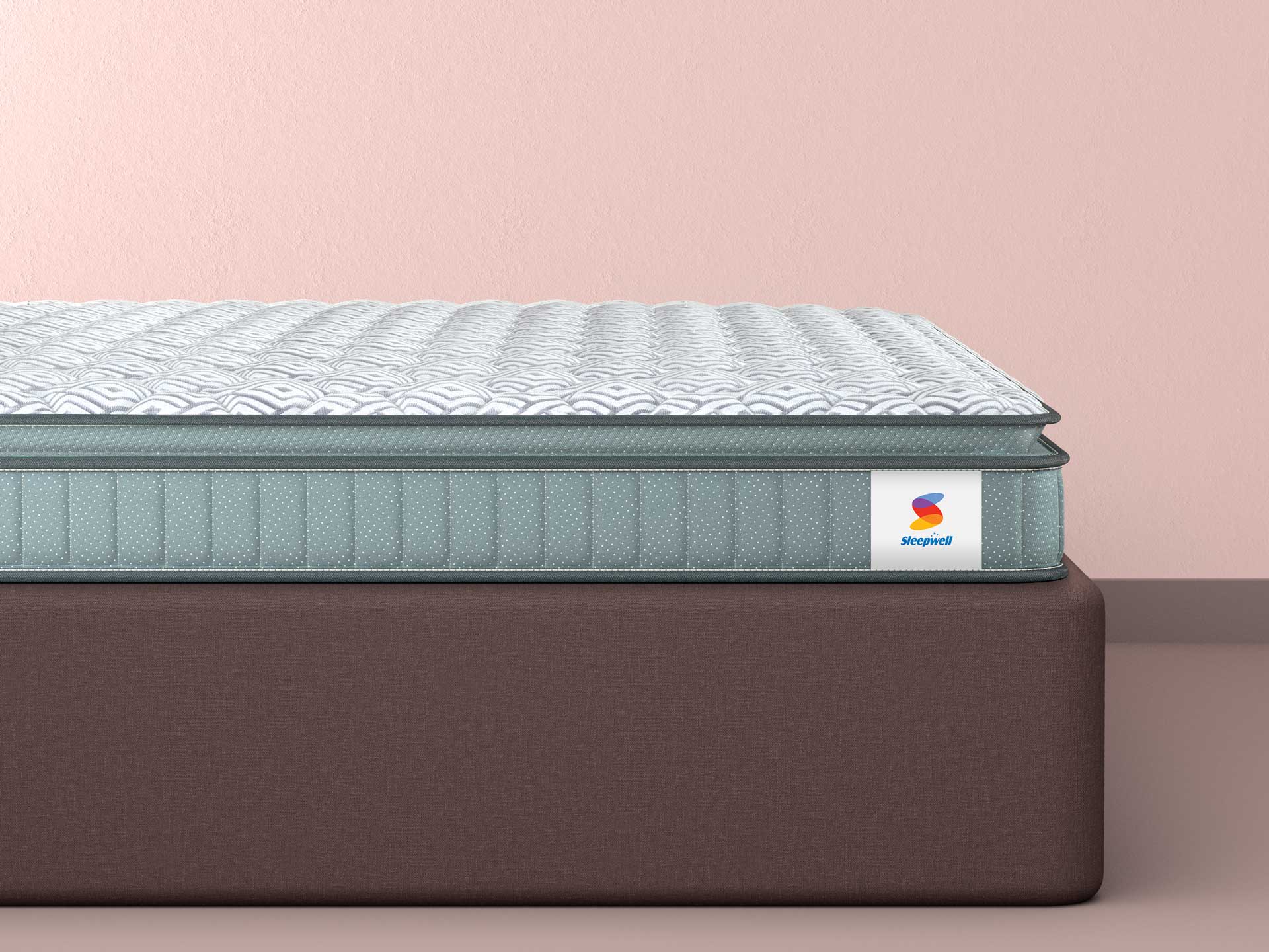 Medium with a plush surface feel thanks to Sleepwell Impressions foam. Premium knitted fabric gives it a smooth touch. A special Sleepwell Resitec® foam adds gentle comfort. Pillow top finish further enhances the plush top feel. Underneath are pocket springs, which are best for gentle responsive body support, and entirely eliminate partner disturbance. Bottom airmesh fabric improves ventilation. Sleepwell Neem Fresche® provides germ protection.