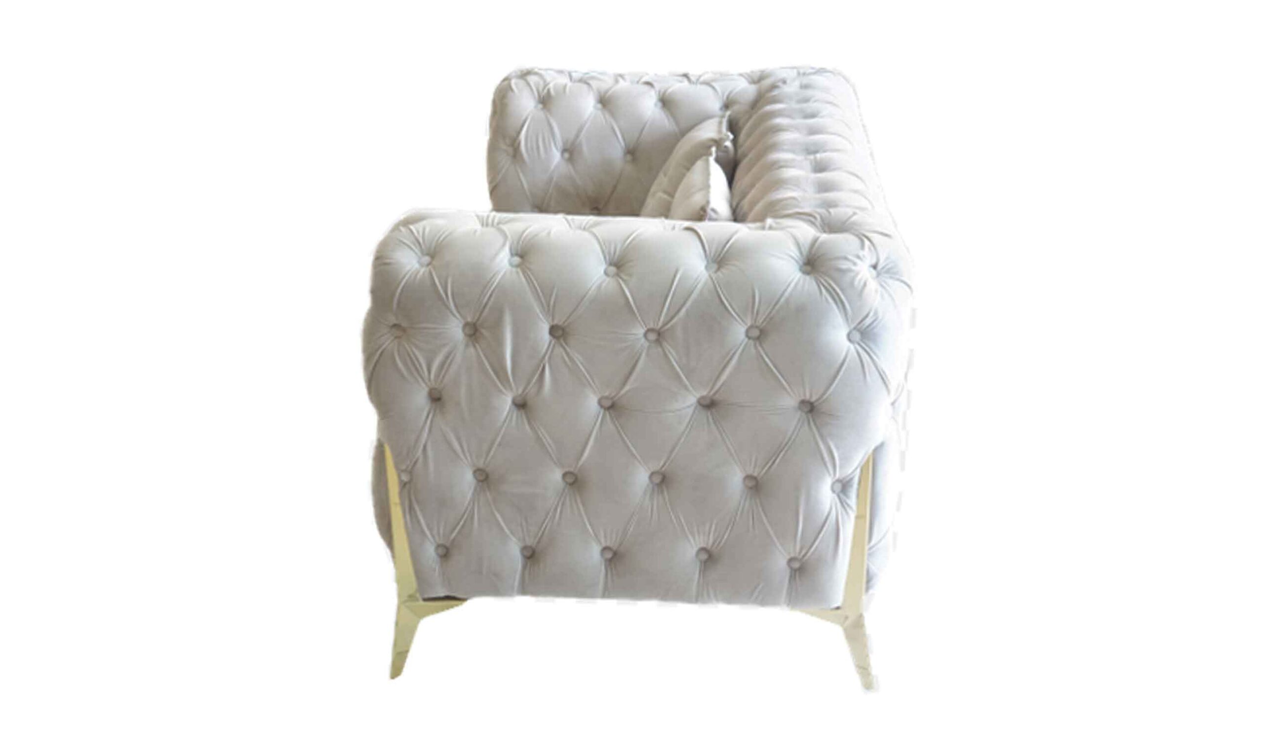 Sofa Vissionaire inspired by italian designs with super soft suede welvet , rich tuffted quilting and rose gold legs gives it an extra ordinary looks.
